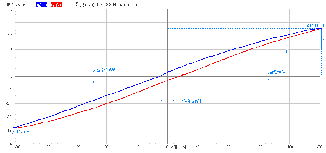 以上是某RV减速器在180N.m和200N.m加载的刚度测试,可以看出,齿隙、空程基本不变,两次测量齿隙的差值是0.002min。刚度测试值,分别是56.1、55.9,有差异,这是因为两次加载的最大转矩不同,分别为202N.m和182N.m,同时这一结果也说明了:随着转矩的增大,刚度值在增大,验证了刚度值随转矩的变化趋势。