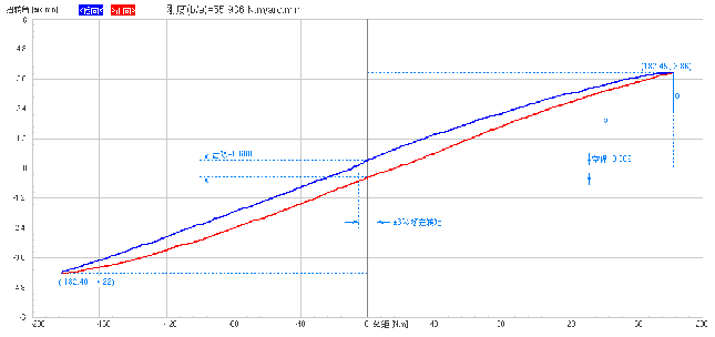 衡量刚度测试是否正确,首先看曲线的变化趋势,刚度的变化趋势是:随着转矩的增大,刚度值逐渐变大,刚度曲线将趋于水平。在转矩增大的过程中,减速器的机械变形量逐渐减小,最终机械变形量达到极限,不再变形,若转矩超过了能承受的最大值后,减速器断裂损坏。如果曲线的变化趋势不对,那么,刚度的测试结果肯定是错误的。我们的刚度曲线如下: